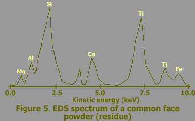 Figure 5 illustrates a spectrum for a common face powder. As with the moisturizer, there is a significant amount of silicon and titanium, as well as magnesium, aluminum, calcium, and iron. Face powders are not readily detected by supervisors and can be worn inside the clean room without being detected.